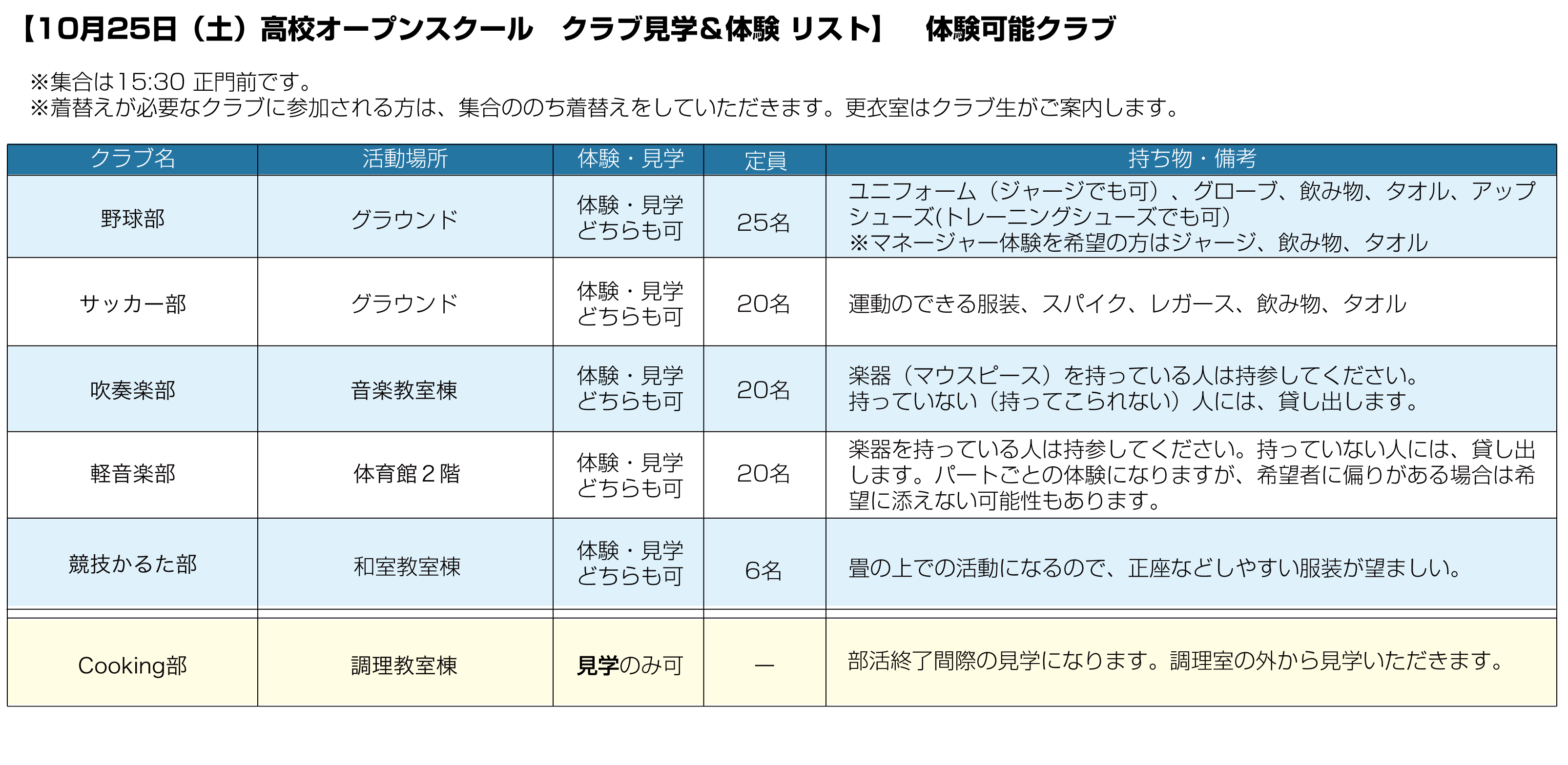 ※この回のオープンスクールで午後のコースにお申込みの方は、クラブ体験会&見学会にご参加いただけない時間帯のものがございます。ご注意ください。