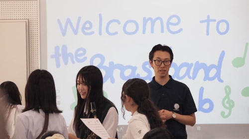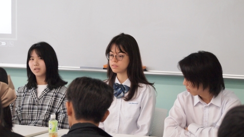 並行して、国際バカロレアコースの説明会が開催されました。卒業生の堤千丈さん、そして在校生の中村カリナさんと中村元信さんによる体験談も催されました。