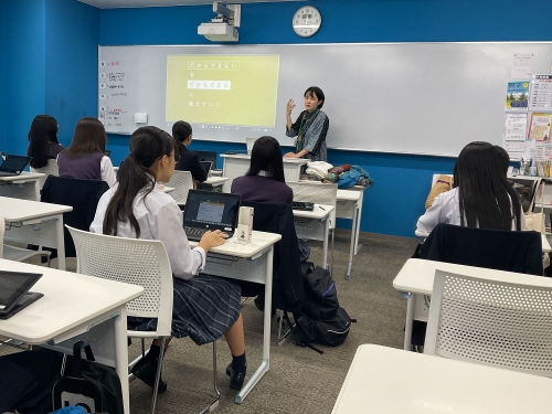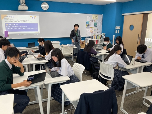 今回は、デザイナーで株式会社イトバナシ代表取締役の伊達文香講師に来校していただきました。参加した生徒たちは、伊達講師のインドでの体験談やインド刺繍への想いを熱心に聞いていました。また、インドの縫製工場のマネージャーのリタさんともオンラインで繋いでいただき、サリーのリサイクル方法などの話を聞くことができました。