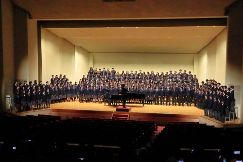 クラスコーラスでは、各クラスにそれぞれ違った苦労があり、はじめは出来上がるのかと心配しましたが、見事にそれぞれのクラスが仕上げてくることができました。3年生の学年コーラスは今まで1,2年生の成果をしっかり出すことができ、さすが3年生と言わんばかりの歌唱力でした。なんといっても最後は全体コーラス、中学全校生徒がそれぞれのパートに分かれ「ひとつの朝」を歌い上げました。約300名がコーラスをするのにはたくさんの苦労があり全員の声を合わせるのにはとても時間がかかりましたが、練習を重ね出来上がった歌がメモリアルホールに響き渡る声は圧巻でした。3学年が一つになる瞬間はとても見ごたえのあるものになりました。