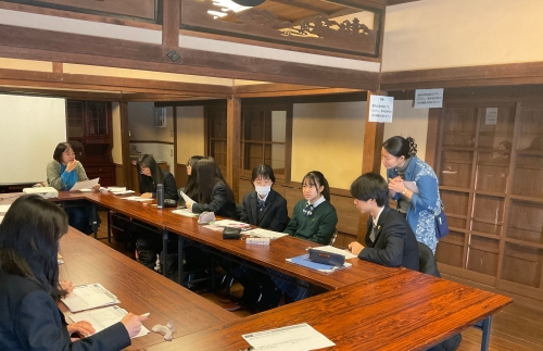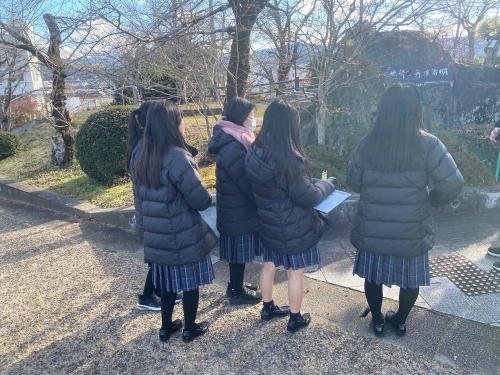 五條市の散策では、ボランティアガイドさんの案内のもと、五條市の歴史を学びつつ、お客様がどんな環境で何を求めてやってくるのか、イメージを高める活動を行いました。生徒たちは、五條市が明治維新発祥の地だということに驚いていました。