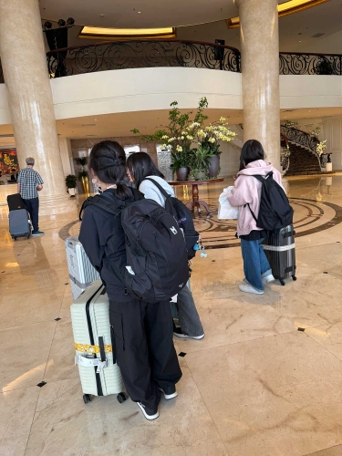 空港からはバスでハロン湾へと移動します。約3時間の道のりの途中、土産物屋に立ち寄りました。刺繍が施された小物、置物、食品など、多くの土産物が並んでおり、ボランティアの緊張感から解放された生徒たちは、買い物を楽しんでいました。土産物店から 1時間ほどバスに揺られて、本日の宿泊先に到着。ホテルの豪華な佇まいに、皆驚きの声を挙げていました。