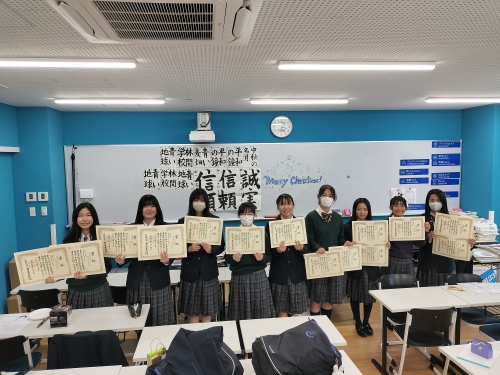 また、半紙の部で2年田中志歩、谷田佳乃、1年中村有希、花本ひまりが推選、1年髙橋冴、永岡愛未、桐村蒼唯が特選、半切1/2の部で田中志歩が推薦、中村有希が特選、花本ひまりが金賞を受賞しました。