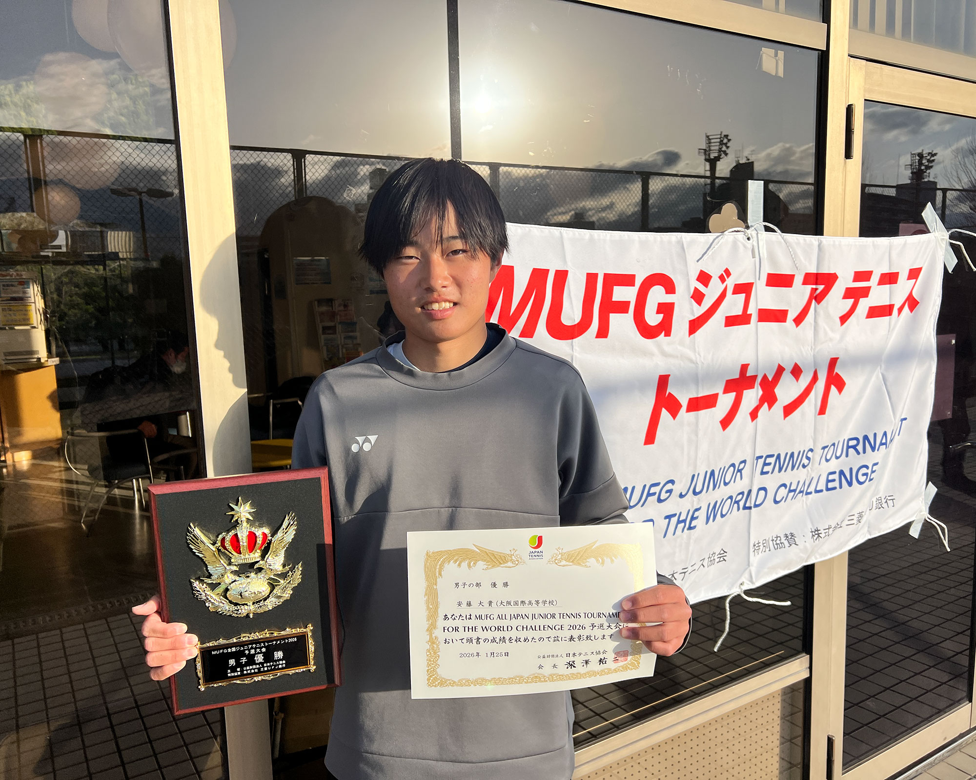 1/24・25に鶴見緑地公園庭球場にて行われた「MUFG全日本ジュニアテニストーナメント大阪大会」において、本校の1年生安藤大貴くんが見事に優勝を果たしました!加えて大阪府から1枠となる代表権も獲得し、4月に岐阜県で行われる全国大会に出場することが決まりました!