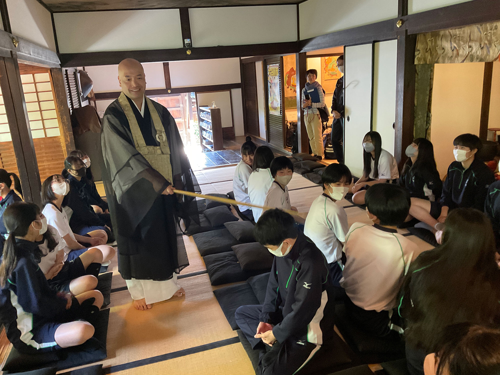 現在では、心身健全と教育のために坐禅をおこなったり、より良いアイデアを引き出すために坐禅が取り入れられるなど、宗派問わず世界中で行なわれるようになりました。生徒たちも住職に教えてもらった通りに足を組んでみるなど興味津々!