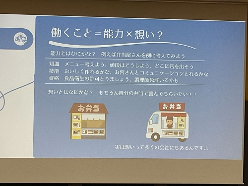 そこで今回の事前学習では、仕事の現場で実際に活躍している方のお話を聞く講演会が行われました。講演を通して、私たちは「働く」という行為の裏側には、たくさんの人々の支えや思い、努力があることを学びました。単にお金を稼ぐためだけではなく、誰かの役に立ちたいという思いや、仲間と協力して一つのことを成し遂げる喜びなど、「働くこと」には様々な意味や価値が込められていることに気づくことができました。