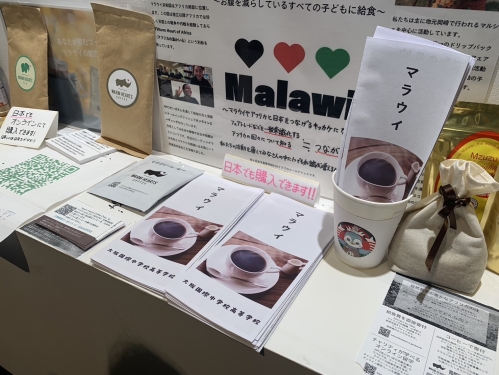 マラウイ講座では、NPO法人せいぼさんが企画している、マラウイのフェアトレードコーヒーを販売する活動を行っています。このコーヒーは1杯が15人分の学校給食に変わります。マラウイの人口はほどんどが子ども。子どもも大事な働き手のため、学校に行く時間がありません。給食を無償でふるまうことで、学校へいくきっかけを作り、学びの機会も提供しているのがこちらの活動です。