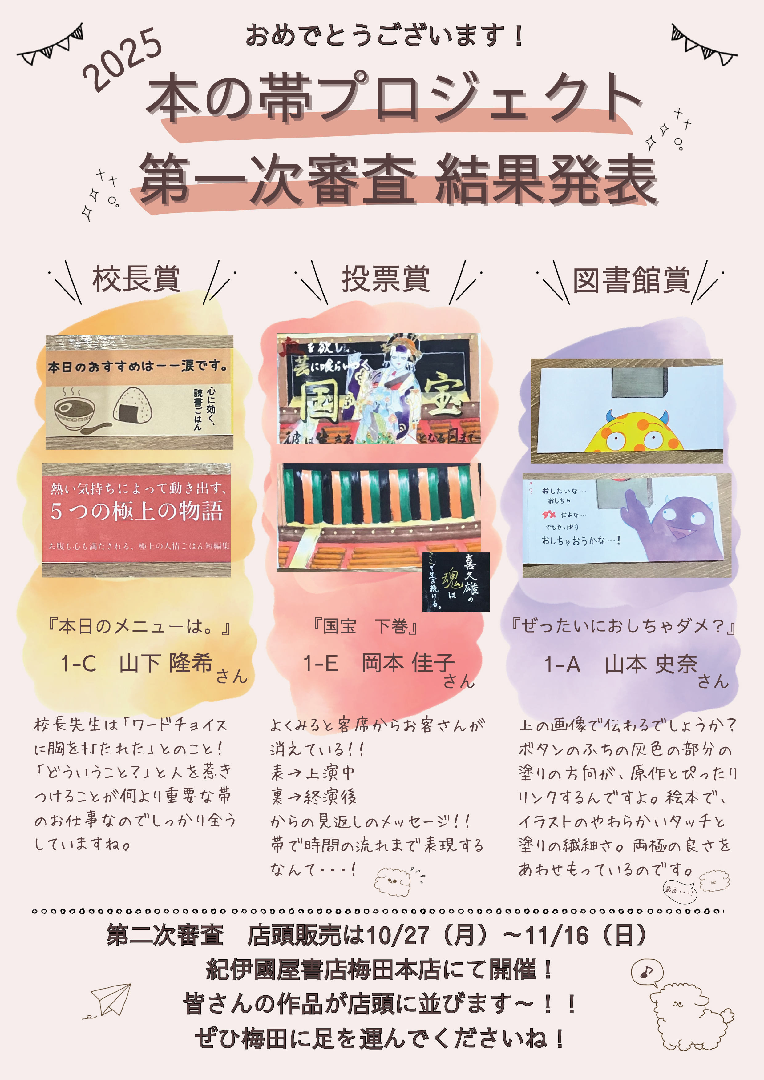 学校で借りた本を読んで、帯を作る校内コンテスト【本の帯プロジェクト】の第一次審査、校内賞がついに発表になりました。
