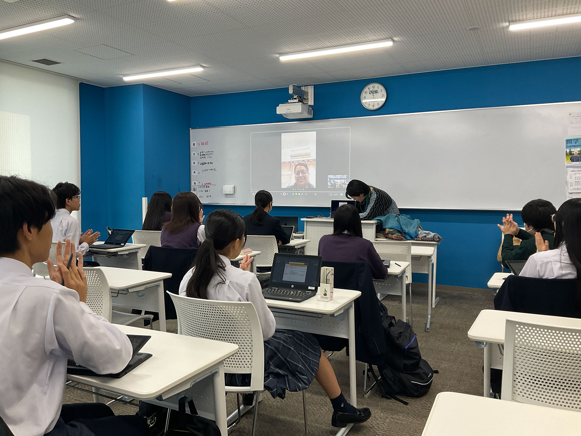 今回は、デザイナーで株式会社イトバナシ代表取締役の伊達文香講師に来校していただきました。参加した生徒たちは、伊達講師のインドでの体験談やインド刺繍への想いを熱心に聞いていました。また、インドの縫製工場のマネージャーのリタさんともオンラインで繋いでいただき、サリーのリサイクル方法などの話を聞くことができました。