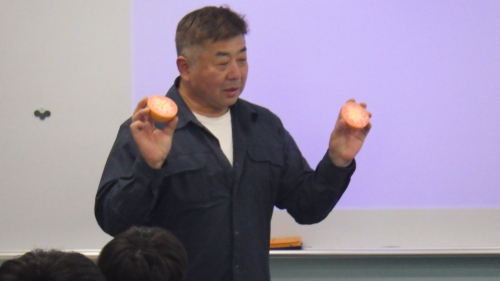 長野県の最北端に位置する飯山市より飯山市役所の藍葉様、小坂様、塩崎農園の塩崎様にお越しいただき、講義をしていただきました。