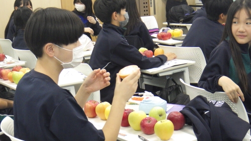 また、果樹専門で農家をされている塩崎農園の塩崎様にはりんごについてのお話をしていただきました。また、塩崎様が中学2年生で果樹農家を志したお話などもしていただき、これから発志式に向けて準備を始める2年生にとっては貴重なお話を聞くことができました。また、お土産に9種類のりんご(王林、秋映、シナノゴールド、シナノスイート、シナノホッペ、ムーンルージュ、王林、名月、炎舞)をいただき生徒たちは大満足でした。塩崎様本当にありがとうございました。