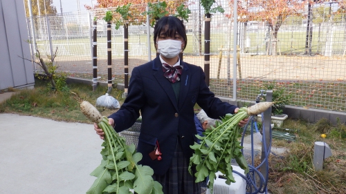 また、9月に種まきをした守口大根も順調に育っています。3学期最初の授業日(1月16日)に守口市役所で開催される守口大根長さコンクールに出展します。昨年の139cmの記録を更新(今年は最低でも150cm)できるようにあと1か月大切に育てたいと思います。