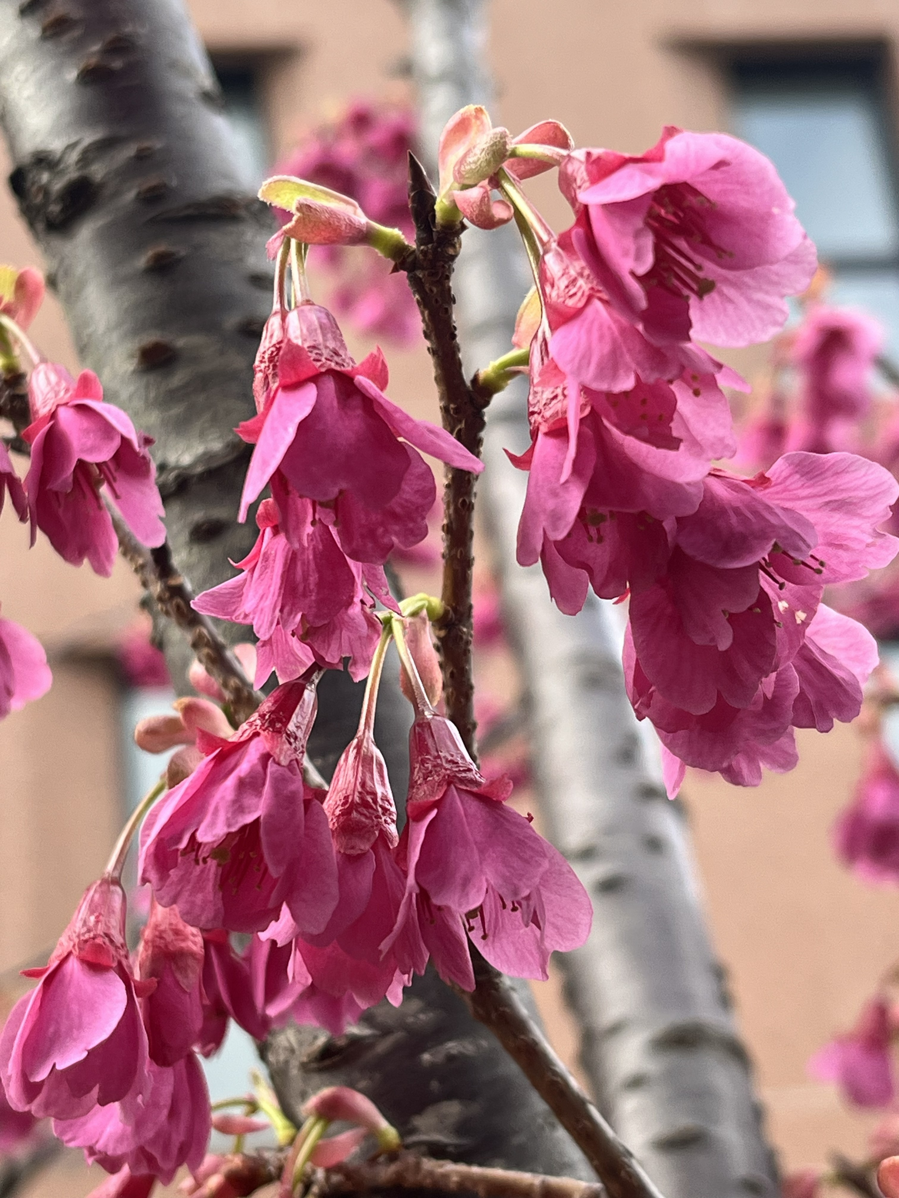 カンヒザクラを漢字で書くと『寒緋桜』。まだ寒い日もある早春に、緋色の花を派手につけるこの種の花の特徴をよく表した名前です。