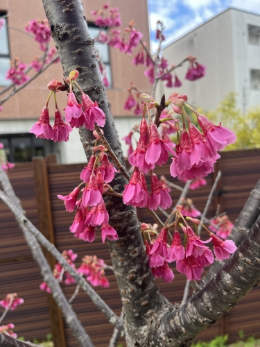 和室棟のカンヒザクラが満開で、一足先に春の到来を告げています。